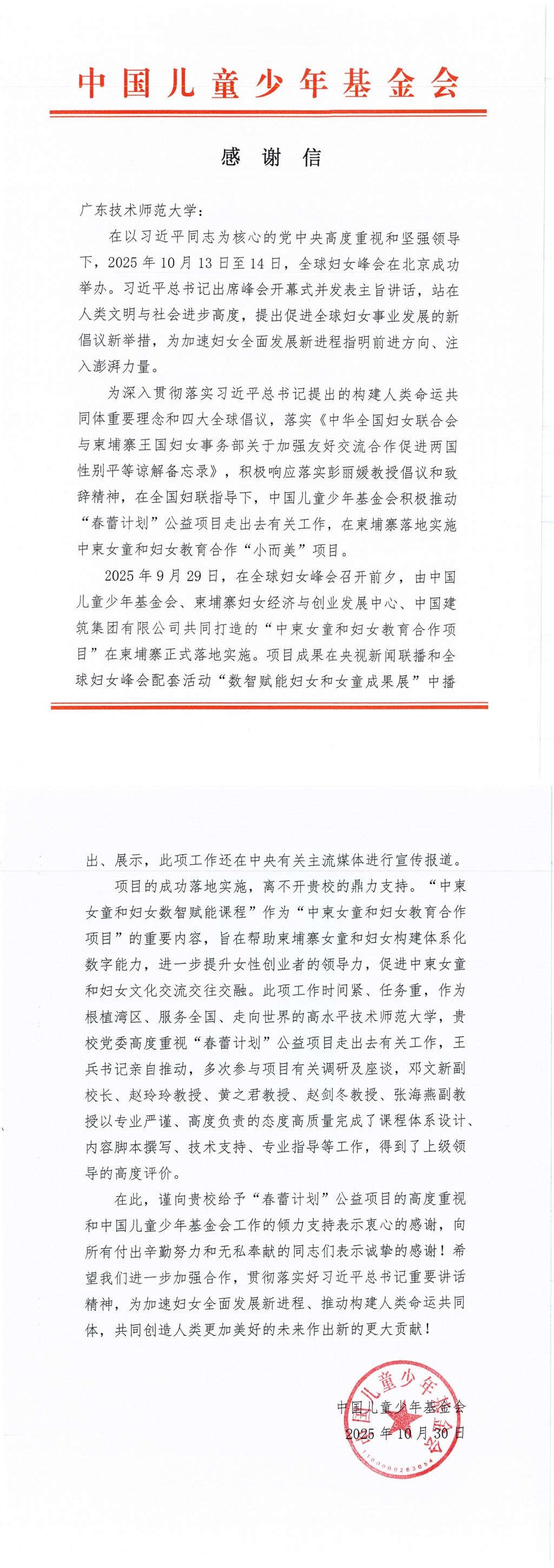 中國(guó)兒童少年基金會(huì)向我校發(fā)來感謝信 贊譽(yù)我校在中柬女童和婦女教育合作項(xiàng)目中貢獻(xiàn)突出